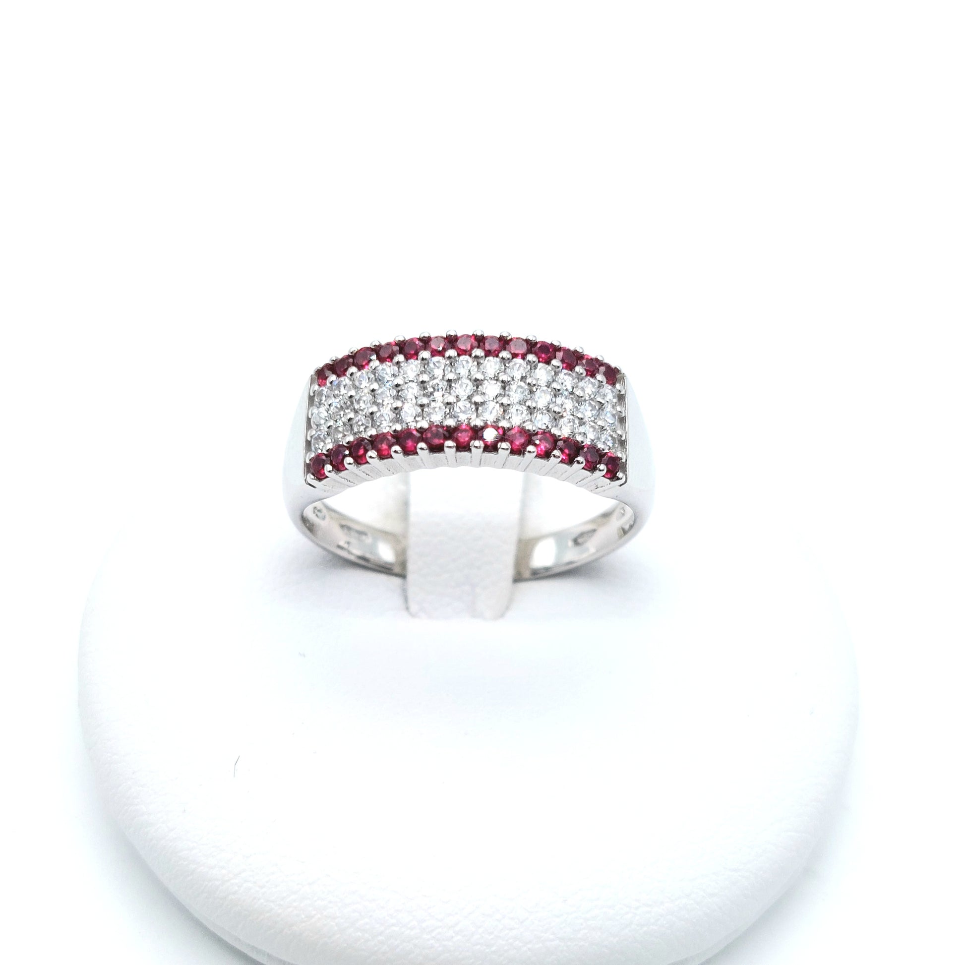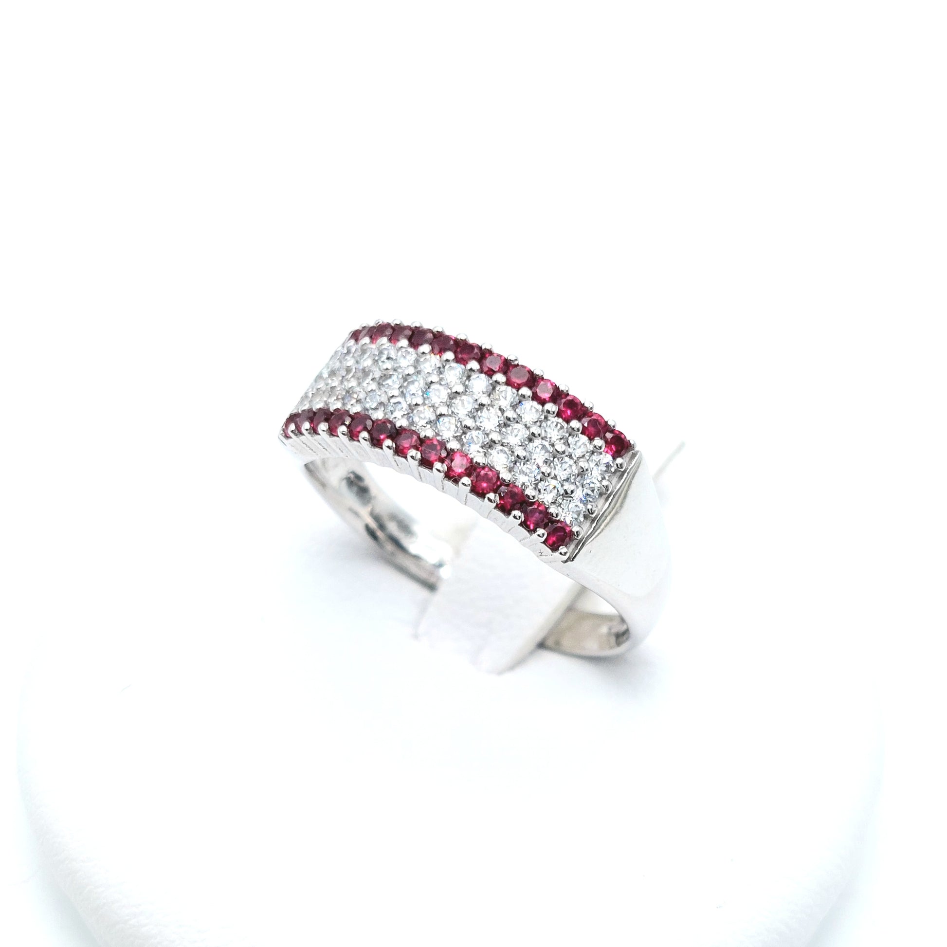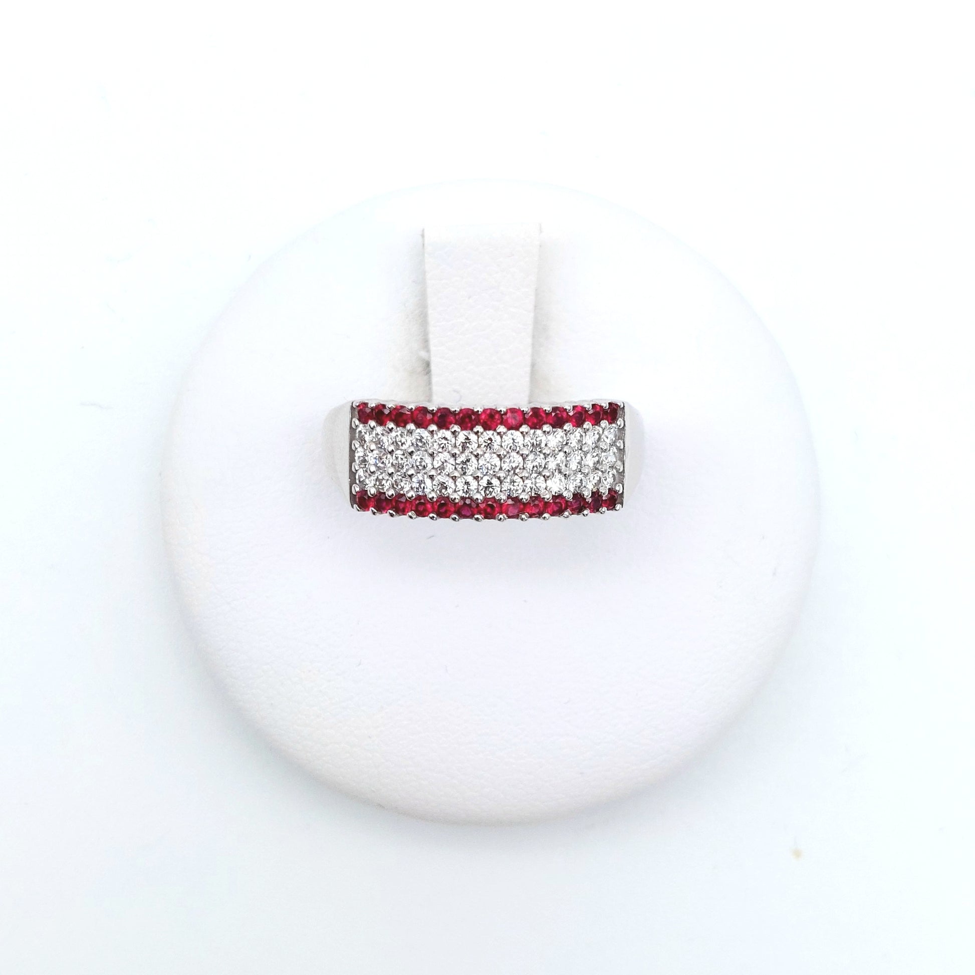 Anello mezza veretta da donna con cinque file di zirconi bianchi e rossi in Oro Bianco 18 KT. AN-ORO093. Misura 15,altezza fascia mm 6.